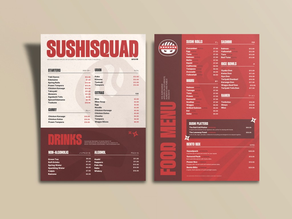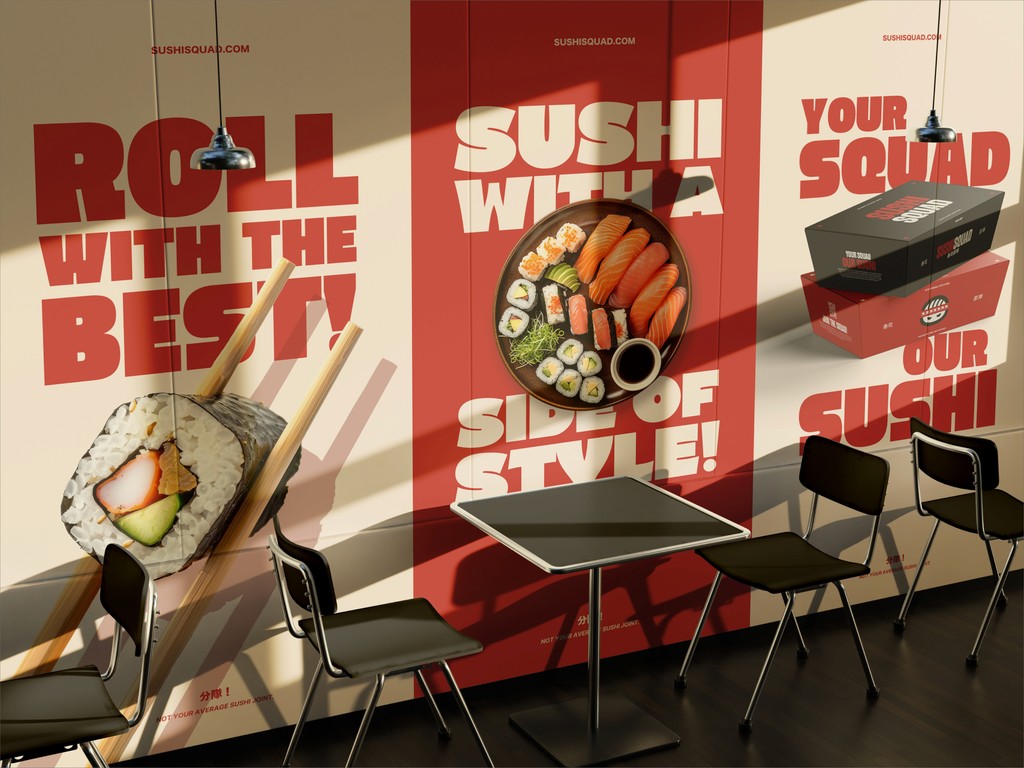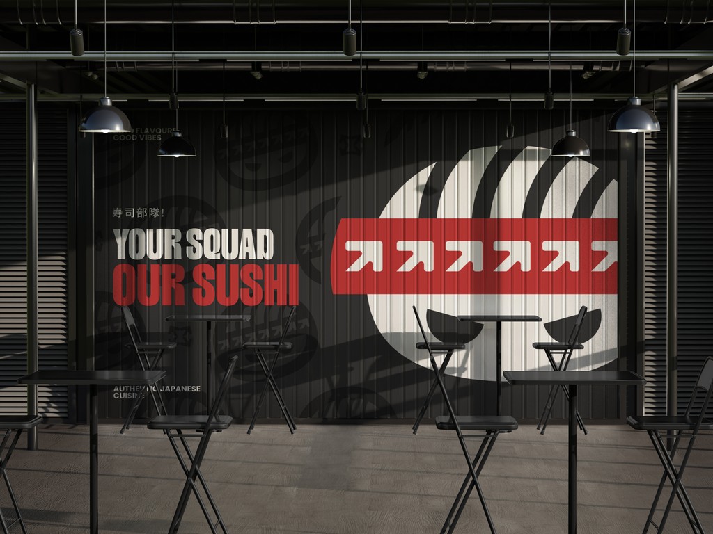 For this personal project, I developed a complete brand identity for SUSHISQUAD, a modern Japanese sushi bar with a bold, playful personality.